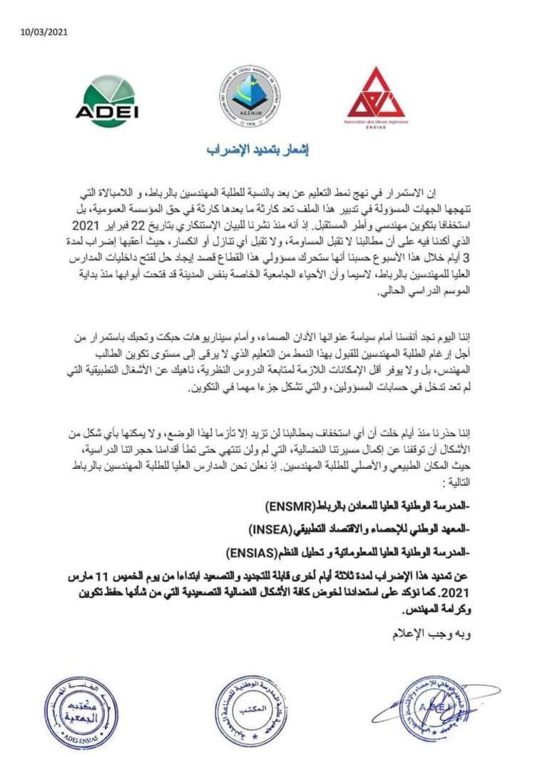 وشدد الطلبة المهندسون، على أنهم لن يتوقفوا عن الاحتجاج والتصعيد، إن لم يعودوا إلى الحجرات الدراسية، معلنين عن تمديد إضرابهم لثلاثة أيام قابلة للتجديد، ابتداء من يوم الخميس 11 مارس الجاري.