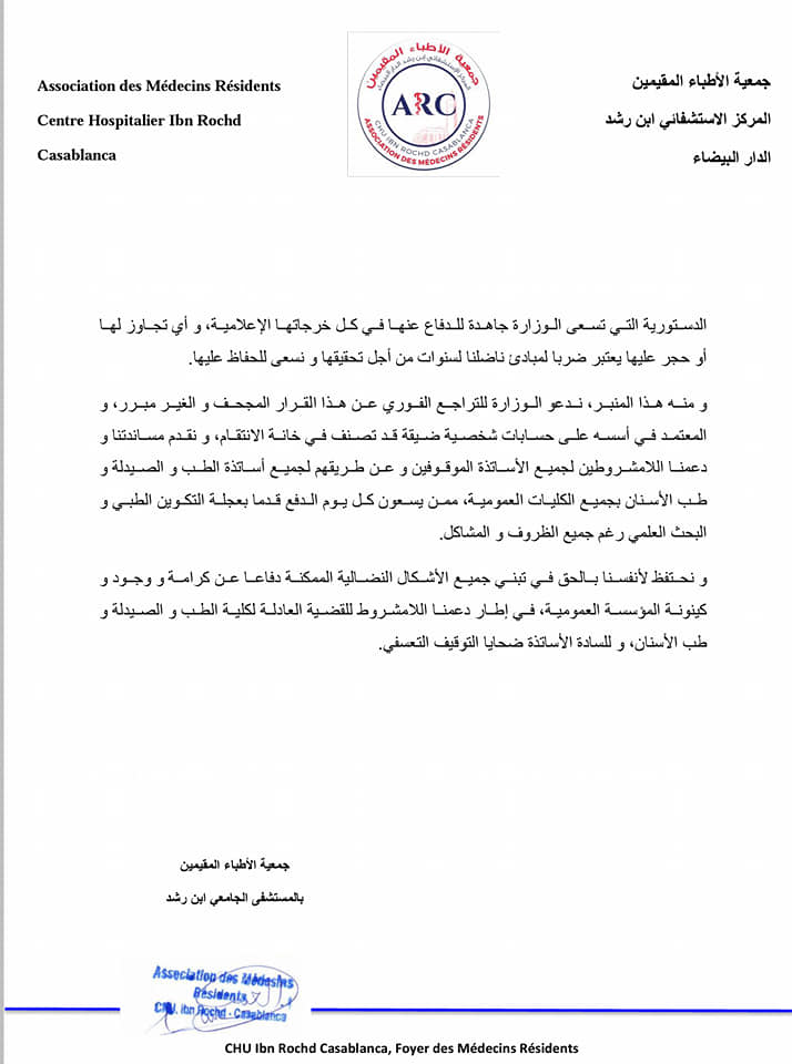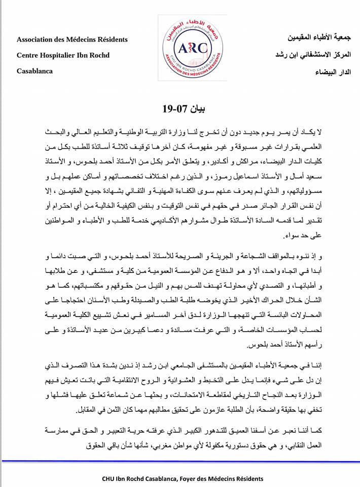 واحتجاجا على قرارات توقيف ثلاثة أساتذة للطب بكل من كليات الدار البيضاء، مراكش و أكادير، أصدرت جمعية الأطباء المقيمين بالمستشفى الجامعي ابن رشد البيان التالي: