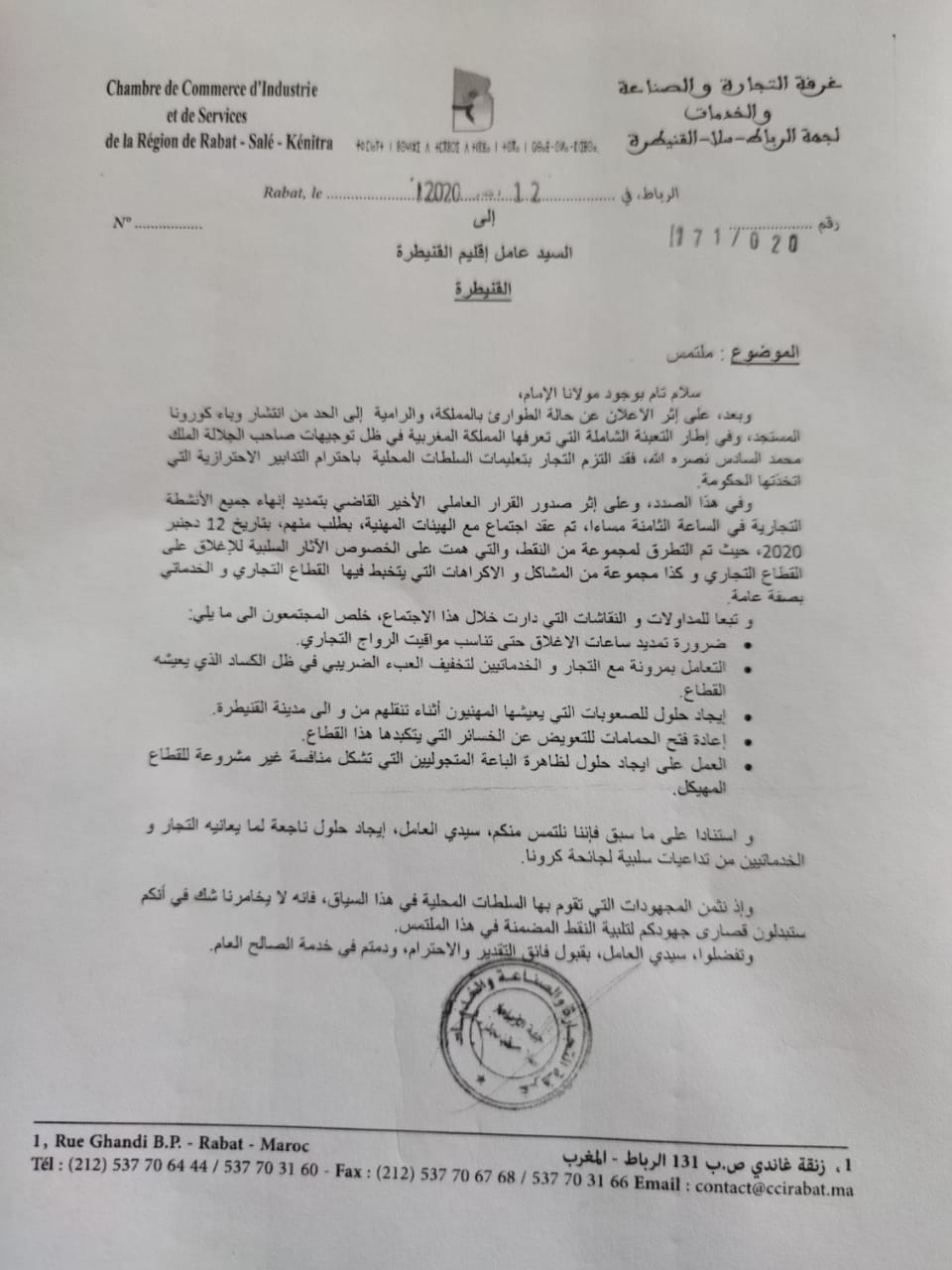 هذا والتمست ملحقة غرفة التجارة والصناعة والخدمات بالقنيطرة من عامل الإقليم التجاوب مع مطالب الفئات المتضررة من تدابير الإغلاق الكلي والجزئي.