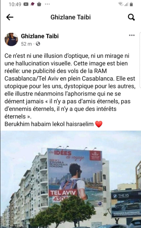 وكتب المرصد المناهض للتطبيع مع دولة الاحتلال الصهيوني “مقدمة الاخبار في النشرات الفرنسية بالقناة الثانية 2M المدعوة غزلان طيبي.. المعروفة بالتوجه المتصهين منذ فترة طويلة .. تحتفي بلوحة إشهارية لشركة الخطوط الملكية المغربية لرحلات طيران تل أبيب-الدارالبيضاء بعد التطبيع الرسمي للدولة وتوقيع اتفاقيات تطبيعية في المجال الجوي مع كيان صهيون..