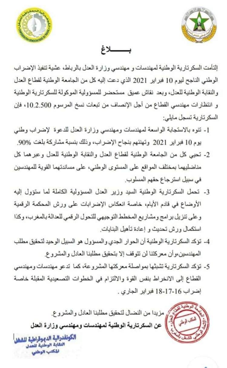 وكانت السكرتارية قد حمّلت في بلاغ سابق لها، وزير العدل”المسؤولية الكاملة لما ستؤول إليه الأوضاع في قادم الأيام، خاصة انعكاس الإضرابات على ورش المحكمة الرقمية وعلى تنزيل برامج ومشاريع المخطط التوجيهي للتحول الرقمي للعدالة بالمغرب، وكذا استكمال ورش تحديث وإعادة تأهيل البنايات”.