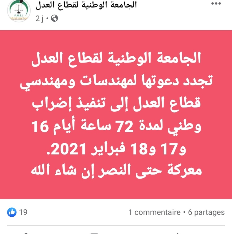 يخوض مهندسو قطاع وزارة العدل منذ أمس الثلاثاء إلى غاية بعد غد الخميس إضرابا وطنيا، احتجاجا على تماطل الوزارة مع مطالبهم وعدم فتح حوار مع السكرتارية الوطنية لمهندسات و مهندسي الوزارة.