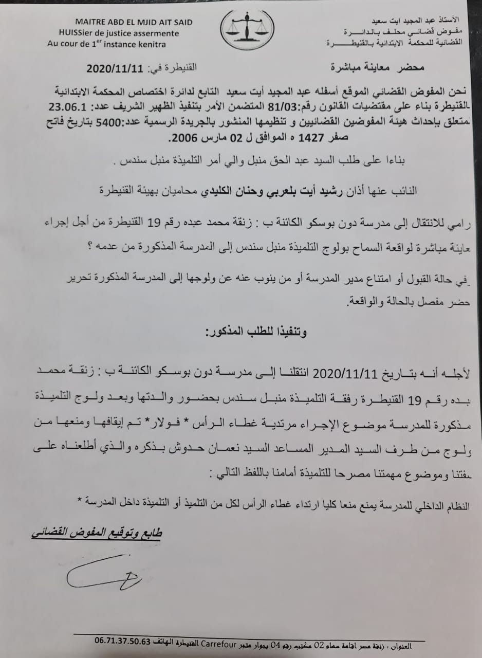 ووفق ما ذكره محضر المحاميان، صدر أمر المنع على لسان المدير المساعد (ن.ح) بالمدرسة الفرنسية، باللفظ التالي: “النظام الداخلي للمدرسة يمنع منعا كليا ارتداء غطاء الرأس لكل من التلميذ أو التلميذة داخل المؤسسة”.