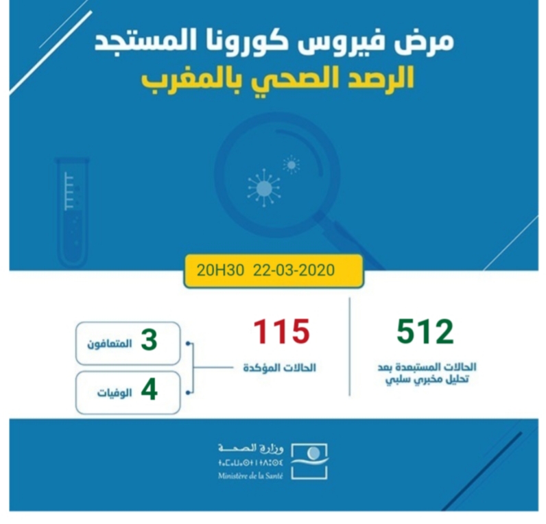 ارتفع عدد الإصابات بفيروس كورونا في المملكة المغربية مساء اليوم الأحد 23 مارس 2020 إلى 115، حيث أفادت معطيات وزارة الصحة الرسمية أن إجمالي الإصابات التي تم تيسجيلها وصل إلى 115 حالة مؤكدة، كما تم تسجيل حالة وفاة رابعة.