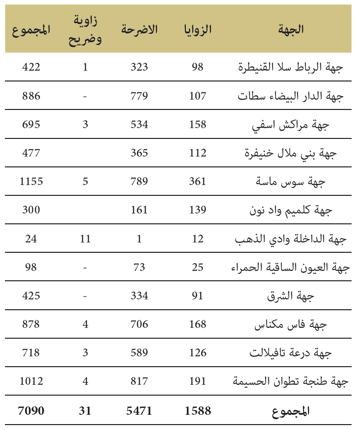 كشفت وزارة الأوقاف والشؤون الإسلامية عبر موقعها الرسمي عن البيانات والإحصائيات المتعلقة بالزوايا والأضرحة لسنة 2019، عن ارتفاع عددها بـ57 بالمقارنة مع سنة 2018، حيث انتقل المجموع من 7033 (2018) إلى 7090 (2019)، موزعة حسب الجدول التالي.