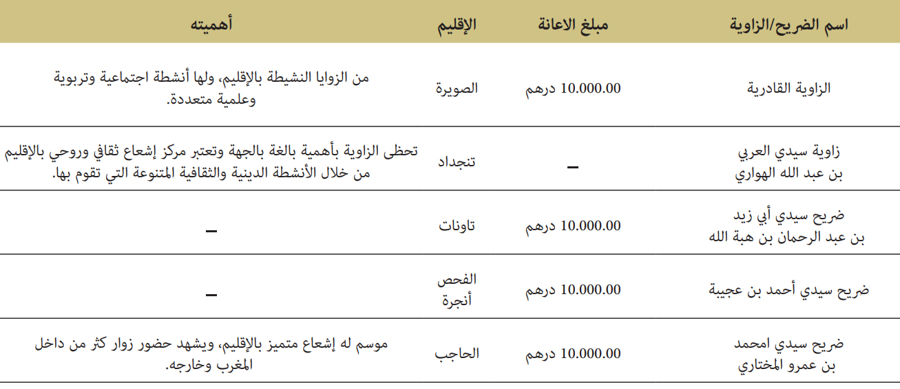 كما نشرت الوزارة جدولا يضم دعم الوزارة المقدم لخمس زوايا وأضرحة، مقدرا في 10 ألاف درهم لكل من الزاوية القادرية، وضريح سيدي أبي زيد بن عبد الرحمان بن هبة الله، وضريح سيدي أحمد بن عجيبة، وضريح سيدي امحمد بن عمرو المختاري، اي مجموع الإعانة لا يتجاوز 40 ألف درهم في سنة 2019، بينما لم تذكر حجم الدعم المقدم لزاوية سيدي العربي بن عبد الله الهواري، وفيما يلي الجدول الذي يضم الإعانات: