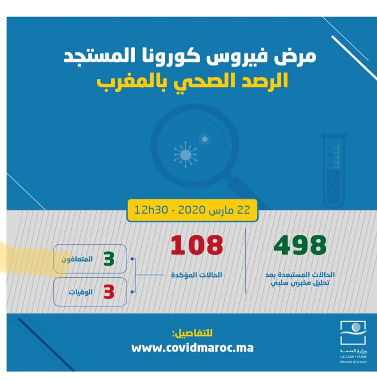 أعلنت وزارة الصحة إلى الرأي العام أنه تم إلى حدود اليوم الأحد 22 مارس 2020، تسجيل 4 حالات جديدة ليرتفع العدد إلى ما مجموعه 108 حالة إصابة مؤكدة بفيروس كورونا المستجد، تم تأكيدها مخبريا بمعهد باستور–المغرب والمختبر الوطني للأنفلونزا والفيروسات التنفسية بالمعهد الوطني للصحة بالرباط، ومختبر المستشفى العسكري