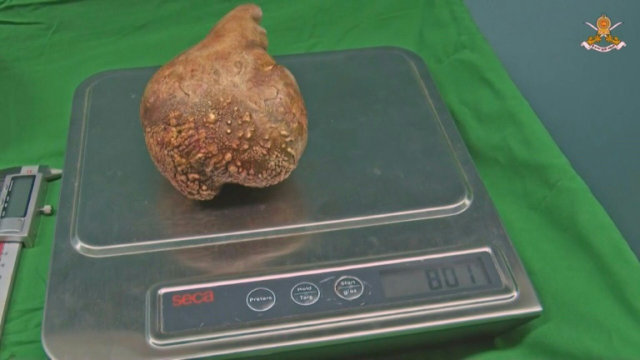 وقال الجراح العسكري ك. سوذارشان “الأهم بالنسبة لنا هو أن تعمل الكلية بشكل طبيعي رغم هذه الحصاة”.