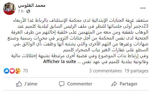 وقال محمد الغلوسي، رئيس الجمعية المغربية لحماية المال العام، إنه “وفي إرتباط بذات الموضوع وفي قضية أخرى مرتبطة بشبهة إختلالات مالية وقانونية ببلدية كلميم في عهد نفس الرئيس والتي أنجزت بخصوصها الفرقة الوطنية للشرطة القضائية محضرا ضخما يتكون من الآف الوثائق ومحاضر والإستماع فإن الوكيل العام للملك لدى محكمة الإستئناف بمراكش لازال لحدود الآن لم يستجب لطلبنا في الجمعية المغربية لحماية المال العام الرامي إلى إخراج ملف القضية من الحفظ وإحالته على قاضي التحقيق المكلف بجرائم الأموال.