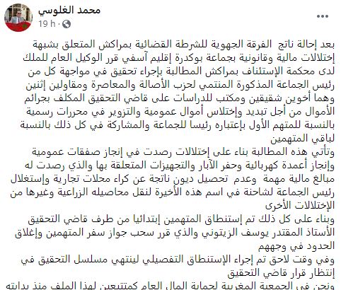 وطالب رئيس الجمعية بضرورة الحزم مع المتهمين في قضايا الفساد المالي واتخاذ إجراءات شجاعة للقطع مع الفساد ونهب المال العام والإفلات من العقاب، فمنطقة بوكدرة بإقليم آسفي غارقة في الظلام والفقر وشبابها يواجه معاناة حقيقية مع البطالة، فيوقت يلجأ بعض المسؤولين إلى استغلال مأساة الناس لقضاء مصالحهم الشخصية ومراكمة الثروة باسم تدبير الشأن العام، ومع ذلك يظلون أحرارا دون عقاب، وهي المفارقة التي تسائل القانون والمؤسسات وفي مقدمتها القضاء.