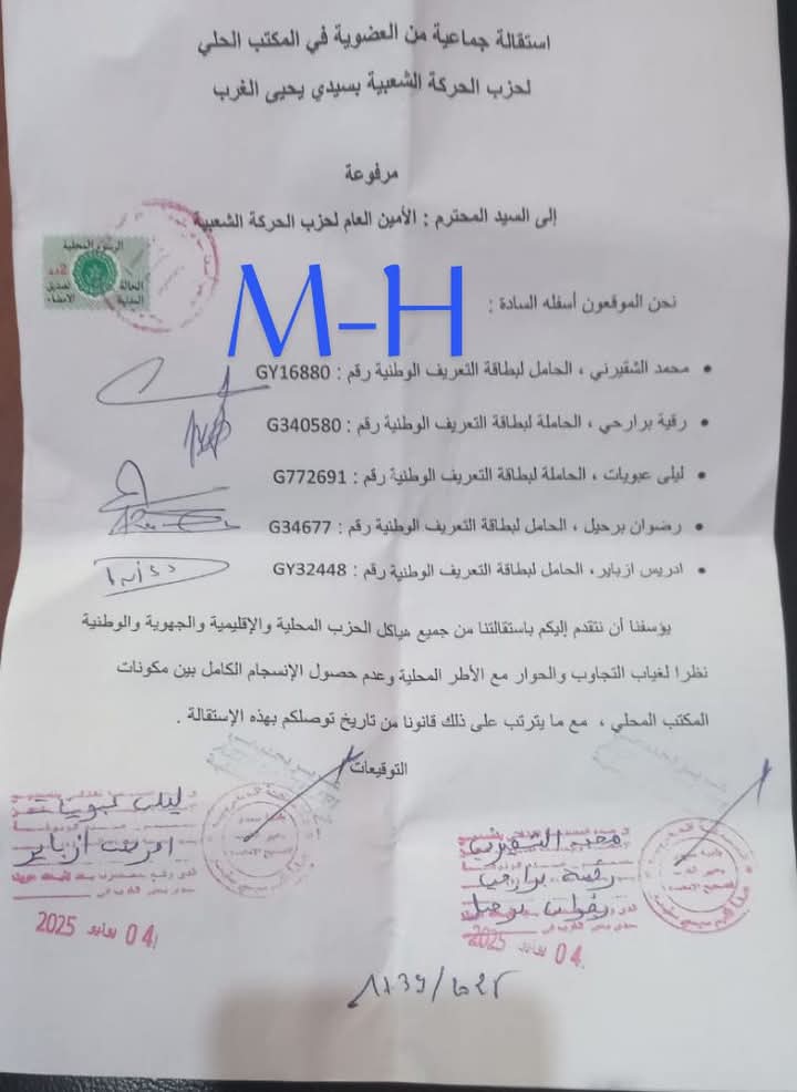 وتُظهر وثيقة الاستقالة المؤرخة بتاريخ 4 يونيو 2025، والموقعة أمام مفوض قضائي، أن الأعضاء المستقيلين قرروا الانسحاب بشكل نهائي من جميع هياكل الحزب على المستويات المحلية والإقليمية والجهوية والوطنية.