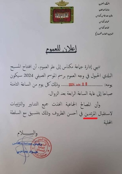 أثار “خطأ فادح” في إعلان نشرته جماعة مكناس لعموم الساكنة -بتوقيع رئيسها- حول موعد افتتاح المسبح البلدي الحبول خلال الموسم الصيفي الحالي (2024)، موجة سخرية كبيرة من طرف رواد مواقع التواصل الاجتماعي.