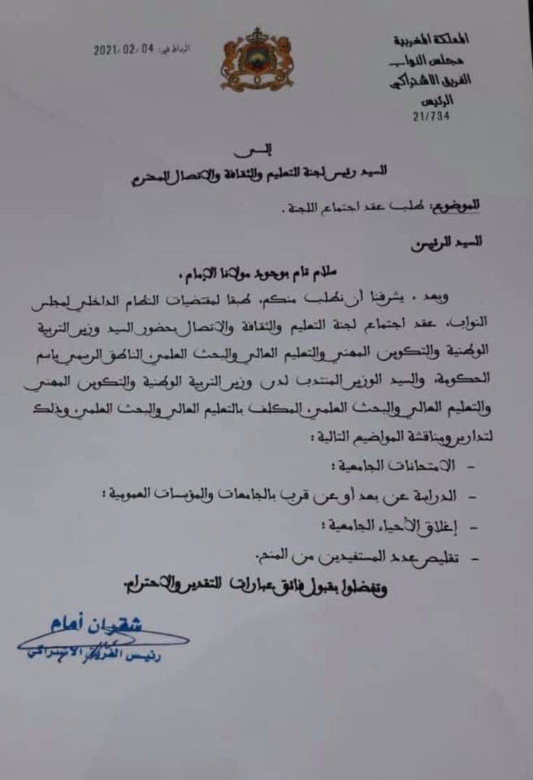طالب فريق الاتحاد الاشتراكي بمجلس النواب سعيد أمزازي، وزير التربية الوطنية والتكوين المهني والتعليم العالي والبحث العلمي، ووزيره المنتدب، ادريس اعويشة، بالحضور العاجل لاجتماع لجنة التعليم والثقافة والاتصال بمجلس النواب، لتدارس الامتحانات الجامعية، والدراسة عن بعد أو عن قرب بالجامعات والمؤسسات العمومية، وإغلاق الأحياء الجامعية، وتقليص عدد المستفيدين من المنح.