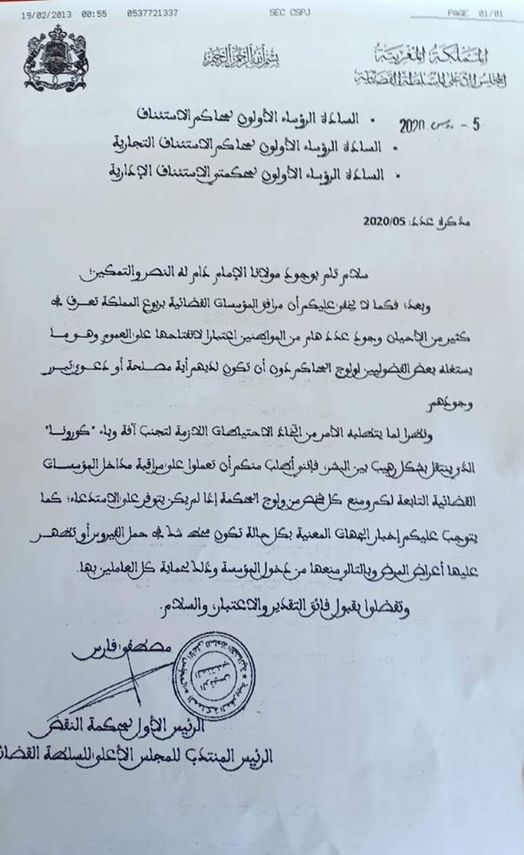 وشددت فارس على ضرورة اتخاذ جميع التدابير والاحتياطات اللازمة لتجنب آفة وباء “كورونا”، ودعا إلى مراقبة مداخل المؤسسات القضائية ومنع كل شخص من ولوجها إذا لم يكن يتوفر على استدعاء.