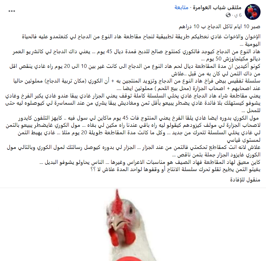 وتابع صاحب المنشور، “أن سلسلة تفقيس بيض فراخ هاد النوع من الدجاج وتزويد المنتجين به + أن الكوري (مكان تربية الدجاج) مملوئين حاليا عند اصحابهم + اصحاب الجزارة (محل بيع اللحم ) مملوئين ايضا ….يعني مقاطعة شراء هاد الدجاج غادي يخلي السلسلة كاملة توقف يعني الجزار غادي يبقا عندو غادي يكبر الفرخ وغادي يشوفو كيستهلك بلا فائدة غادي يضطر يبيعو بأقل تمن ومغاديش يبقا يشري من عند السماسرة لي كيوصلوه ليه حتى للمحل ..”.