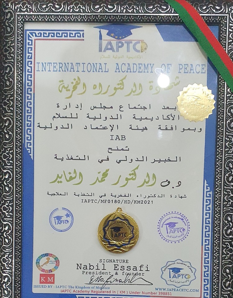 وأشارت الأكاديمية في تدوينة على صفحتها على فيسبوك، إلى أن هذا التتويج للدكتور محمد الفايد، الخبير الدولي في التغدية الصحية والعلاجية، بشهادة الدكتوراه الفخرية من الأكاديمية يأتي:” اعترافا وتقديرا وافتخارا بكونه مرجعا دوليا فريدا من نوعه في عالم التغدية والصحة والعافية”.