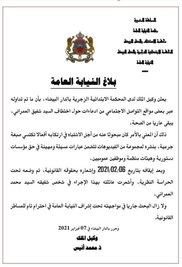 أعلن وكيل الملك لدى المحكمة الإبتدائية الزجرية بالدار البيضاء، بأن ما تم تداوله عبر بعض مواقع التواصل الاجتماعي من اداعاءات حول اختطاف السيد شفيق العمراني، يبقى عاريا من الصحة.
