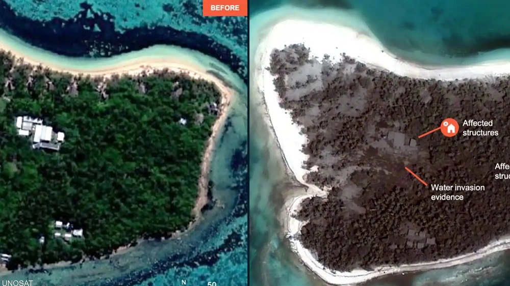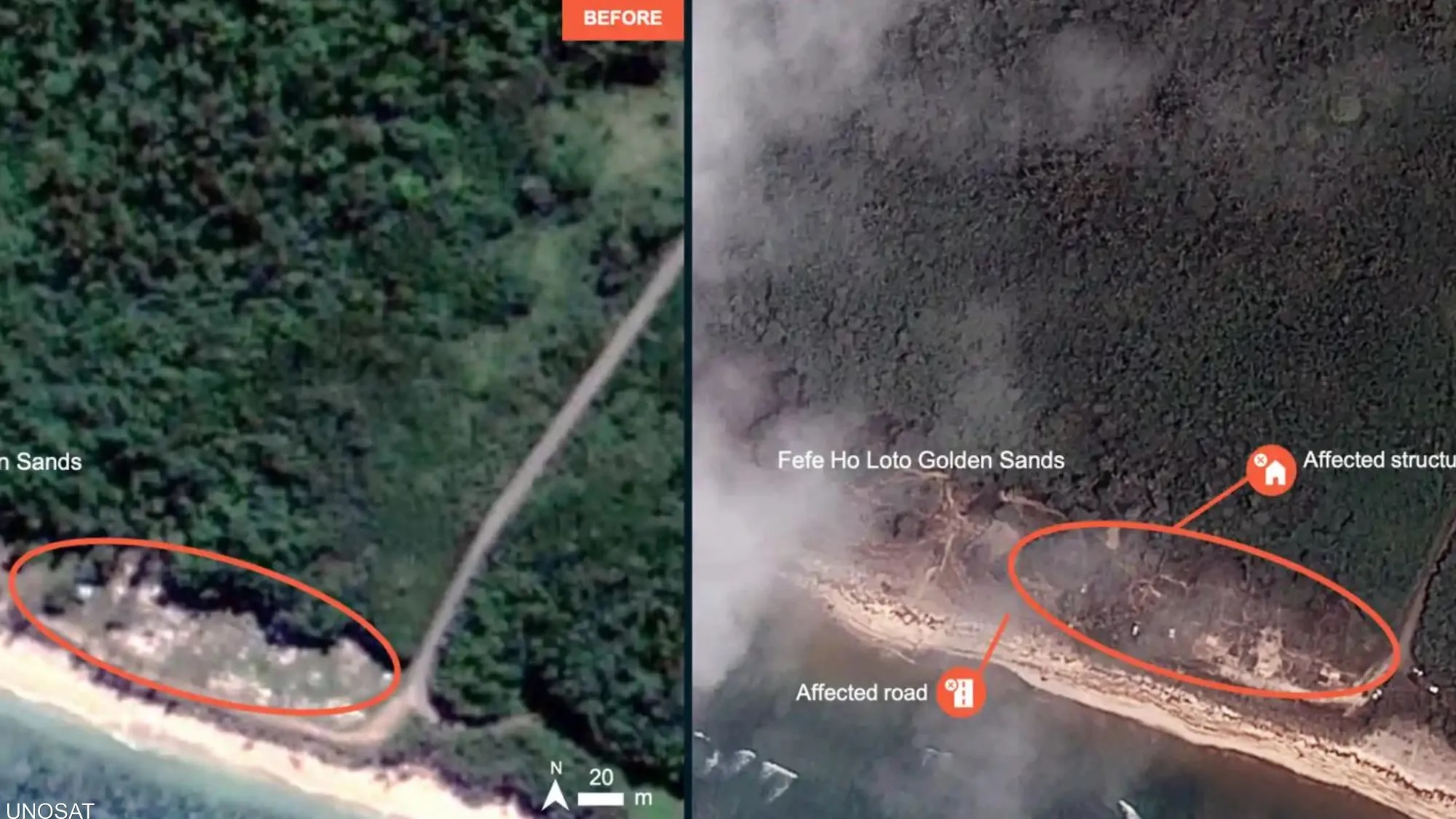 كذلك أظهرت صور خاصة بمركز الأمم المتحدة للأقمار الصناعية، مشاهد مماثلة في جزر كولوموتوا وتونغاتابو وكولوفو أوو وفافاو، حيث انهار عدد من المباني، وسط انتشار كثيف للرماد.