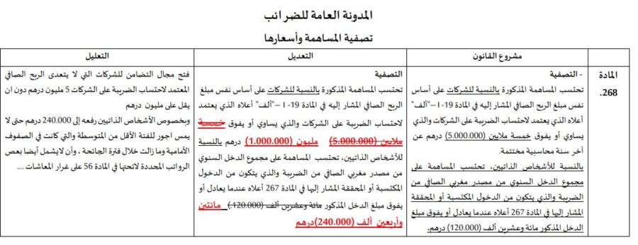 أما في ما يتعلق بالشركات، فتُحتسب المساهمة على أساس نفس مبلغ الربح الصافي المشار إليه في المادة 19 الذي يعتمد لاحتساب الضريبة على الشركات والذي يساوي أو يفوق مليون درهم (عوض 5 ملايين) عن آخر سنة محاسبية مختتمة.