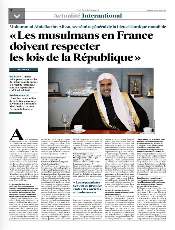 في مقابلة خص بها أسبوعية “لوجورنال دو ديمانش” الفرنسية في عددها الصادر الأحد، شدد محمد بن عبد الكريم العيسى، الأمين العام لرابطة العالم الإسلامي ومستشار ولي العهد السعودي محمد بن سلمان للشؤون الدينية، على ضرورة أن يخضع مسلمو فرنسا لقوانين الجمهورية أو المغادرة، مشيرا إلى أنه تحدث عن ذلك مرة أخرى يوم الأربعاء الماضي مع وزير الخارجية الفرنسي جان إيف لودريان.