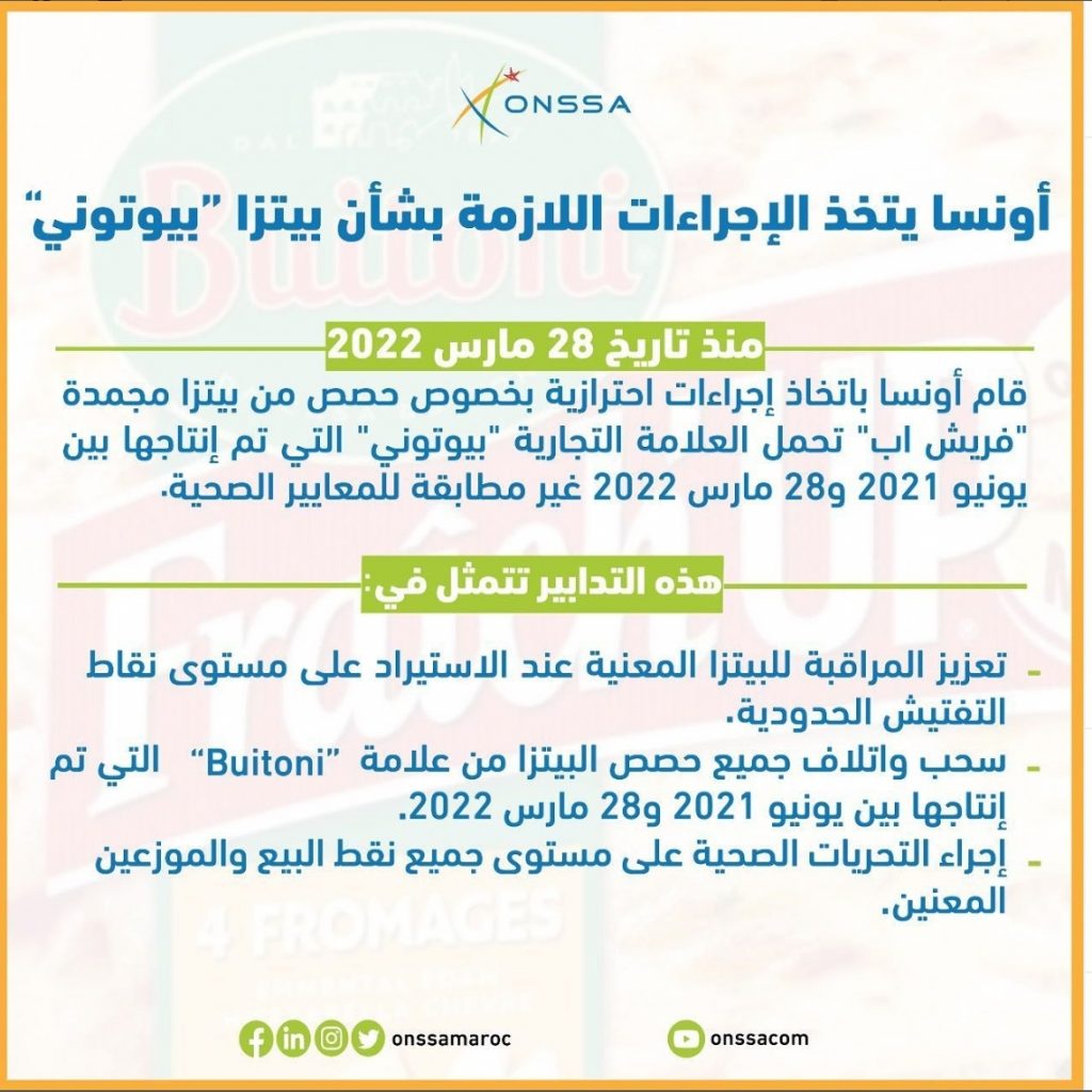 أعلن المكتب الوطني للسلامة الصحية للمنتجات الغذائية أنه قام باتخاذ إجراءات احترازية منذ 28 مارس، بخصوص حصص من بيتزا مجمدة من نوع “فريش آب”، تحمل العلامة التجارية “بيوتوني، لأنها “غير مطابقة للمعايير الصحية”.