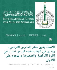 الإتحاد العالمي لعلماء المسلمين يدين مقتل المدرس الفرنسي ويدين في الوقت نفسه تصريحات العنصرية والكراهية بفرنسا