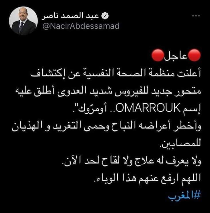 نشر الإعلامي المغربي بقناة الجزيرة عبد الصمد ناصر تغريدة على صفحته الرسمية على “تويتر”، جاءت ردا على ما وصفه بالأبواق المعادية للمغرب، وعلى رأسها بعض زملائه في قناة الجزيرة دون أن يذكر الأسماء، واعتبرهم مصابين بفيروس جديد يدعى أومروك “OMARROUK “.