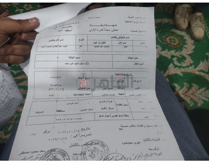 وأضاف عم الشاب العائد بعد دفن جثمانه بشهر في المنوفية، خلال تصريحات خاصة لـ القاهرة 24، أنه توجه إليه، وبالفعل تعرف على الشاب الموجود داخل العناية المركزة جراء حادث قطار، كما تعرف عليه أيضًا والده ووالدته وأشقاؤه والعديد من أفراد الأسرة، وحاولت الأسرة علاجه بعد دخوله في غيبوبة تامة نتيجة الحادث، ولكنه توفي متأثرا بإصابته الخطيرة.