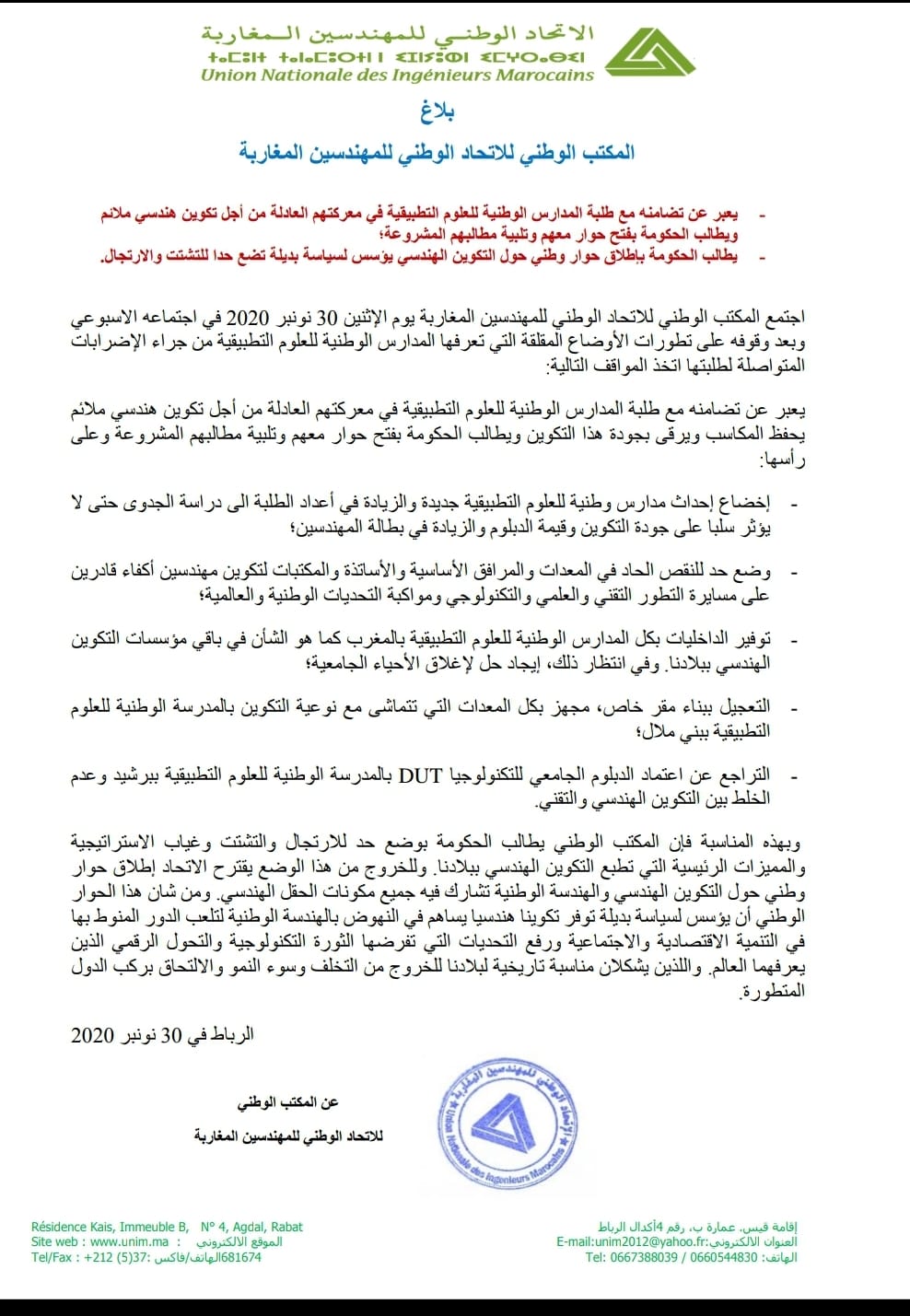 ودعا الاتحاد، إلى عدم الخلط بين التكوين الهندسي والتقني، مطالبا بالتراجع عن اعتماد الدبلوم الجامعي للتكنولوجيا DUT بالمدرسة الوطنية للعلوم التطبيقية ببرشيد.