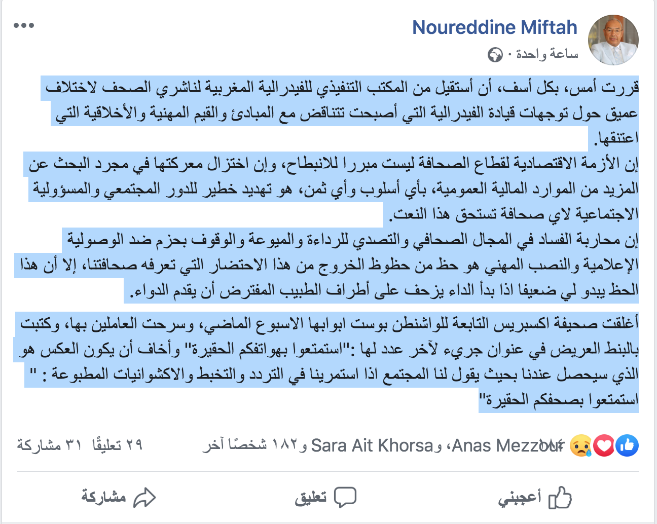 وذكر مفتاح في تدوينة على حائطه الأزرق أنه قرر تقديم إستقالته من المكتب التنفيذي للفيدرالية المغربية لناشري الصحف لاختلاف عميق حول توجهات قيادة الفيدرالية التي أصبحت تتناقض مع المبادئ والقيم المهنية والأخلاقية التي اعتنقها.