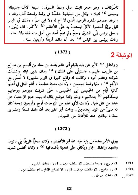 البكري الذي نقل عنه.. قال كلاما قبل هذا الذي نقله كلاب.. كما ذكر الأستاذ الباحث عزالدين زحال في منشور له واقرؤوه من مصدره كما في الوثيقتين (1-2): “وولد إلياس (بن صالح بن طريف) منهم يونس، فتولّى الأمر بعد أبيه فأظهر ديانتهم ودعا إليها وقتل من لم يدخل فيها حتى أخلى ثلاثمائة مدينة وسبعًا وثمانين مدينة، حمل جميع أهلها على السيف لمخالفتهم إيّاه، وقتل منهم بموضع يقال له تاملّوكاف، وهو حجر نابت عالٍ وسط السوق، سبعة آلاف وسبعمائة وسبعين قتيلاً، وقتل من صنهاجة خاصة في وقعة واحدة ألف وغد،..” (المسالك والممالك).