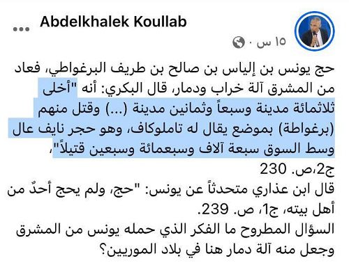 حيث نشر تدوينة في حسابه على فيسبوك، ذكر فيها “حج يونس بن إلياس بن صالح بن طريف البرغواطي، فعاد من المشرق آلة خراب ودمار، قال البكري: أنه “أخلى ثلاثمائة مدينة وسبعًا وثمانين مدينة، حمل جميع أهلها على السيف لمخالفتهم إيّاه، وقتل منهم بموضع يقال له تاملّوكاف، وهو حجر نابت عالٍ وسط السوق، سبعة آلاف وسبعمائة وسبعين قتيلاً” (ج2 ص230)، قال ابن عذاري متحدثا عن يونس: “حج، ولم يحج أحد من أهل بيته” ج1 ص239″.