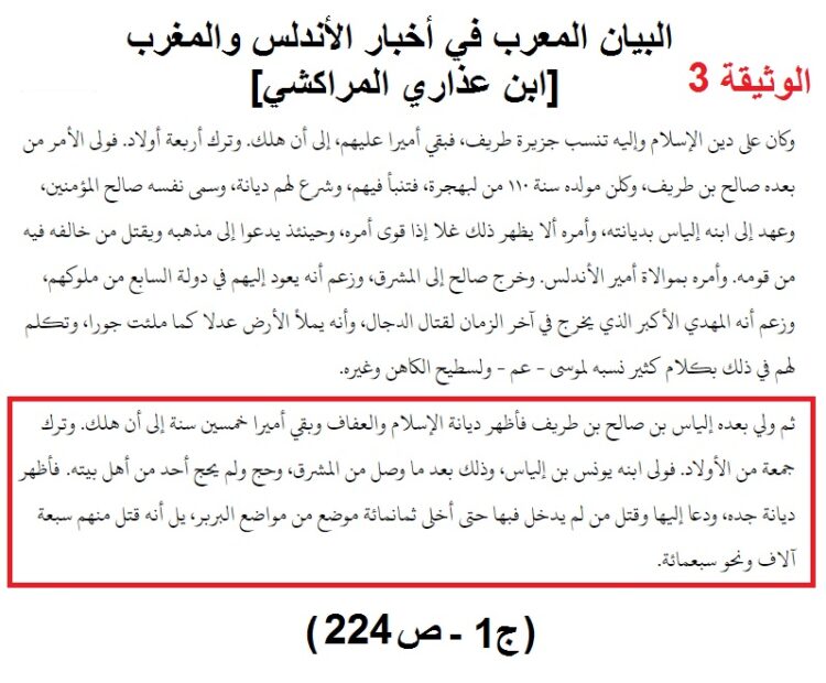 فابن عذاري أيضا يذكر كما ذكر البكري (إن لم يكن هو فقط ناقلا عن البكري): “فأظهر ديانة جده ودعا إليها وقتل من لم يدخل فيها..) (الوثيقة 3).. كفى من التدليس على الأتباع والقراء..!!