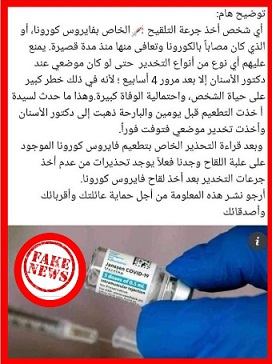 بعد انتشار منشور خطير على الفايسبوك، يزعم “أن كل شخص تلقى جرعة من اللقاح المضاد لفيروس كورونا، أو كان مصابا بكورونا وتعافى منه، يمنع عليه أخذ أي مخدر طبي، حتى لو كان هذا المخدر موضعيا، كالذي يؤخذ عند طبيب الأسنان، لأن ذلك قد يشكل خطرا على صحته وقد يتسبب في وفاته”.