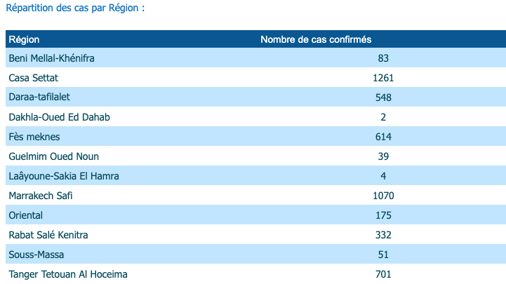 وأوضحت الوزارة حسب جدول يبين توزيع الحالات  4880 على جهات المملكة: