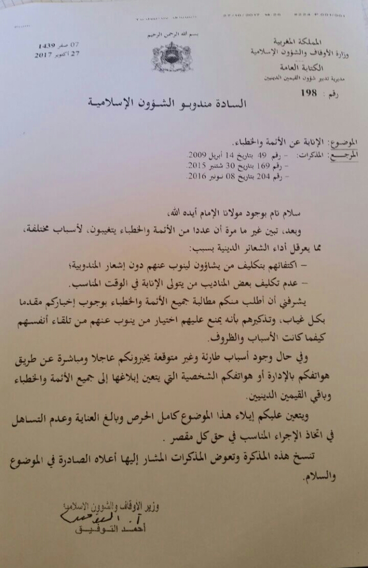وأضاف الوزير الذي اشتهر بإقالته لمئات الأئمة والخطباء: “يشرفني أن أطلب منكم مطالبة جميع الأئمة والخطباء بوجوب إخباركم مقدما بكل غياب، وتذكيرهم بأنه يمنع عليهم اختيار من ينوب عنهم من تلقاء أنفسهم كيفما كانت الأسباب والظروف”.