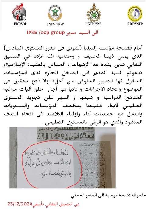 دخلت على خط فضيحة مدرسة إلبيليا الابتدائي بمدينة آسفي، بعد اعتماد أستاذة بها لمادة التربية الفنية للمستوى السادس مطبوعا يحتوي نصا من الإنجيل، الجامعة الوطنية لقطاع الفوسفاط عن طريق التنسيق النقابي بآسفي.