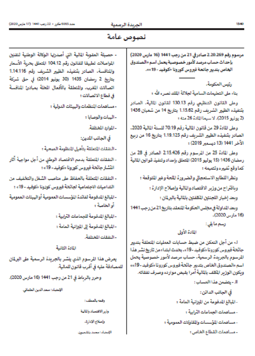 أصدرت الحكومة اليوم الثلاثاء، مرسوم “إحداث الصندوق الخاص بتدبير جائحة فيروس كورونا “كوفيد -19″” على صفحات الجريدة الرسمية.
