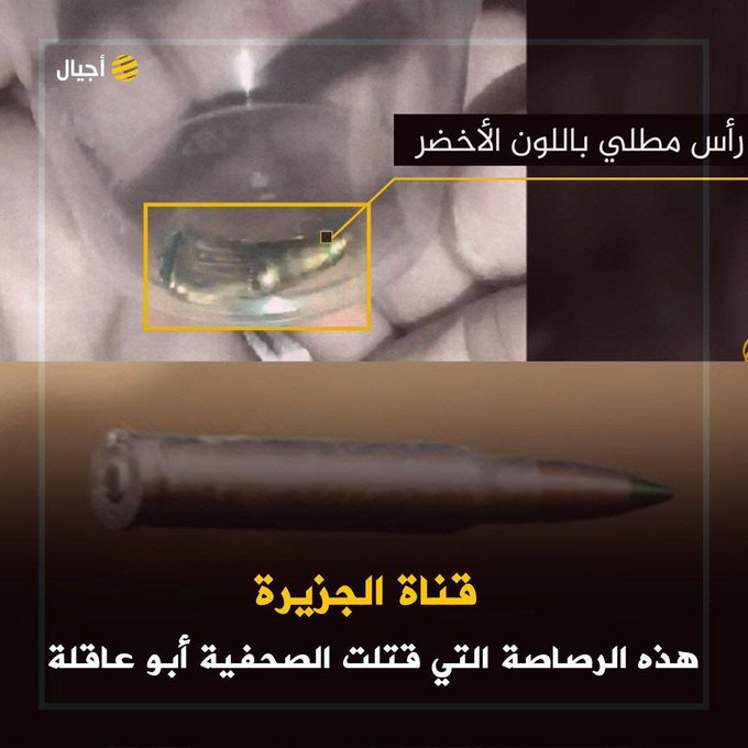 قناة الجزيرة تنشر صورة الرصاصة التي أدت الى استشهاد الصحفية شيرين أبو عاقلة: وقالت الجزيرة أن التحقيق يُشير الى أن هذه الرصاصة خارقة للدروع وتُطلق من سلاح m4 الذي يستخدمه جيش الاحتلال pic.twitter.com/LmK8CgzKUy