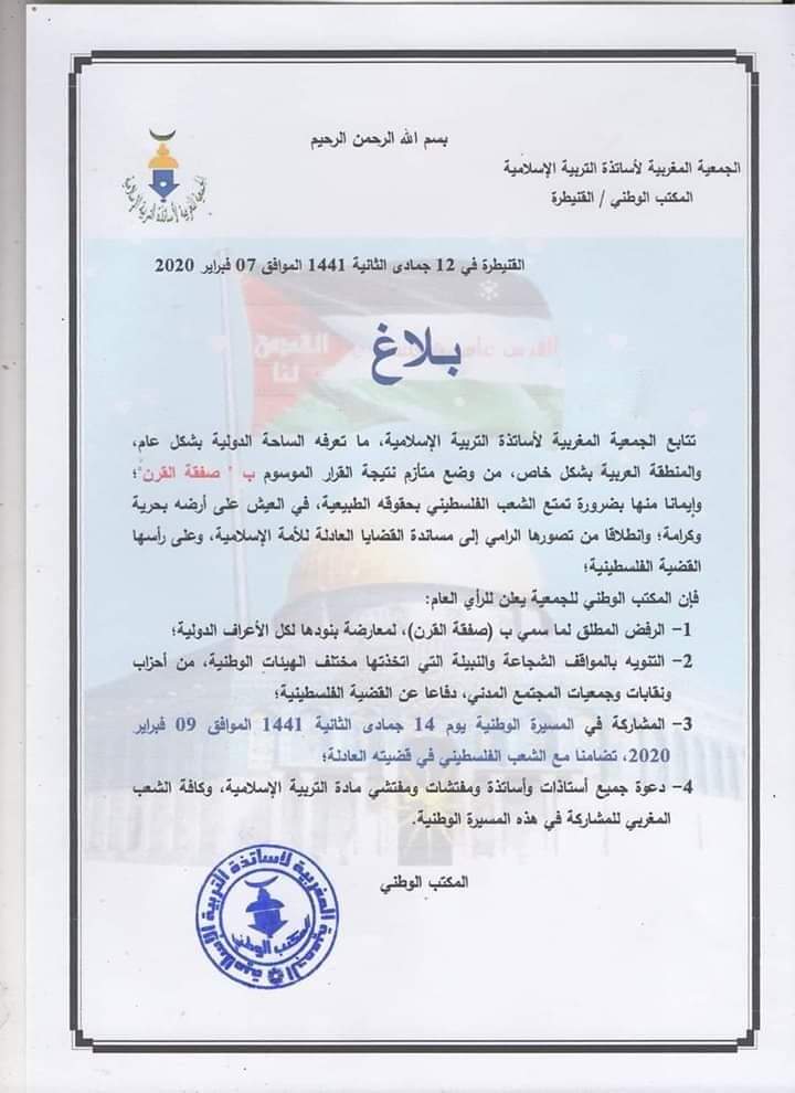 “تتابع الجمعية المغربية لأساتذة التربية الإسلامية، ما تعرفه الساحة الدولية بشكل عام، والمنطقة العربية بشكل خاص، من وضع متأزم نتيجة القرار الموسوم ب”صفقة القرن”؛ وإيمانا منها بضرورة تمتع الشعب الفلسطيني بحقوقه الطبيعية، في العيش على أرضه بحرية وكرامة؛ وانطلاقا من تصورها الرامي إلى مساندة القضايا العادلة للأمة الإسلامية، وعلى رأسها القضية الفلسطينية؛
