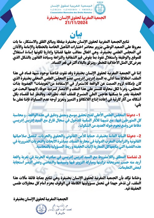 وجاء في بيان للجمعية توصلت “هوية بريس” بنسخة منه “تتابع الجمعية المغربية لحقوق الإنسان بخنيفرة بيقظة وببالغ القلق والاستنكار، ما بات معروفا على الصعيد الوطني بتزوير محاضر اختبارات التأهيل الخاصة بالخطابة والإمامة والأذان في المجلس العلمي بخنيفرة، وهي أفعال معاقب عليها قضائيا وإداريا لكونها إساءة واستغلال للموقع والوظيفة واستغلال نفوذ بما يقوض قيم الشفافية والنزاهة وسيادة القانون بالشكل الذي يعرض كل المثل الأخلاقية للخطر، وينزلق بالبلاد أكثر في قعر الفساد”.