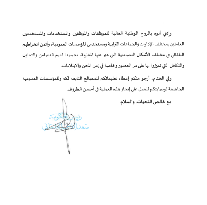 أصدر رئيس الحكومة سعد الدين العثماني منشورا اليوم الثلاثاء للمساهمة في الصندوق الخاص بتدبير جائحة فيروس كورونا، وذلك نظرا للظروف التي تمر بها البلاد يقضي بالاقتطاع من أجور الموظفين وذلك من أجل دعم صندوق مواجهة فيروس كورونا الذي أمر الملك محمد السادس بإنشائه.