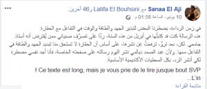 سناء العاجي لم تسكت على النيل من شرفها، والتشكيك في مصداقيتها ومستواها العلمي، فسارعت بنشر رسالة على حسابها توضح فيها ما اتهمها به صاحب الانفجار الجنسي، الذي كالت له أيضا السب والشتم، حيث استهلت تلك الرسالة بعبارات بدا واضحا أنها غاضبة جدا، حين قالت: