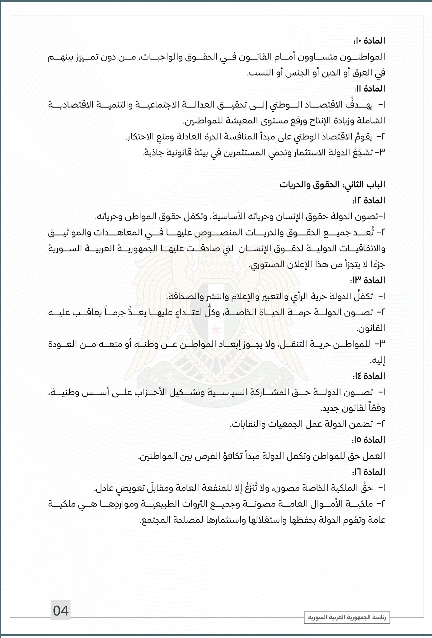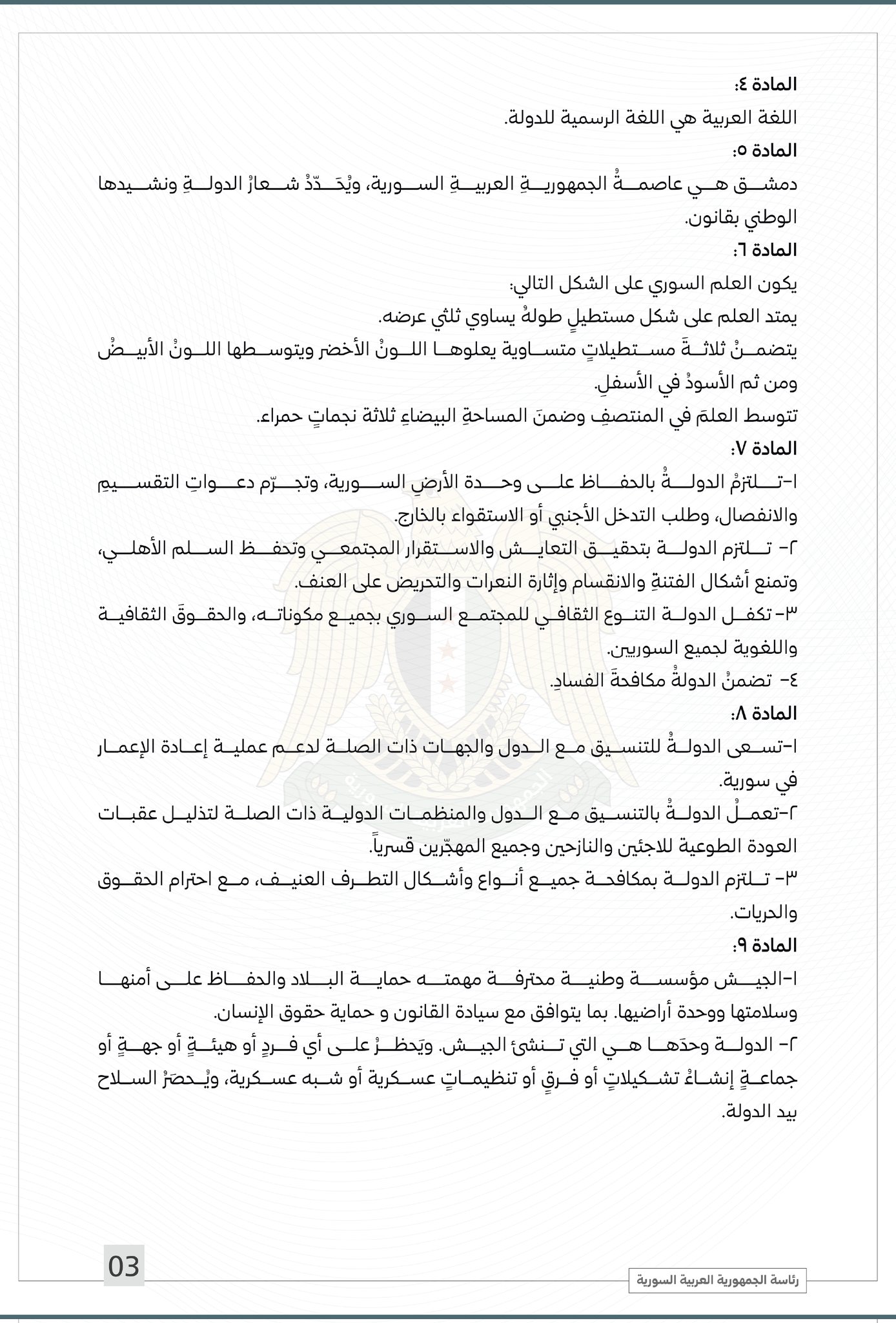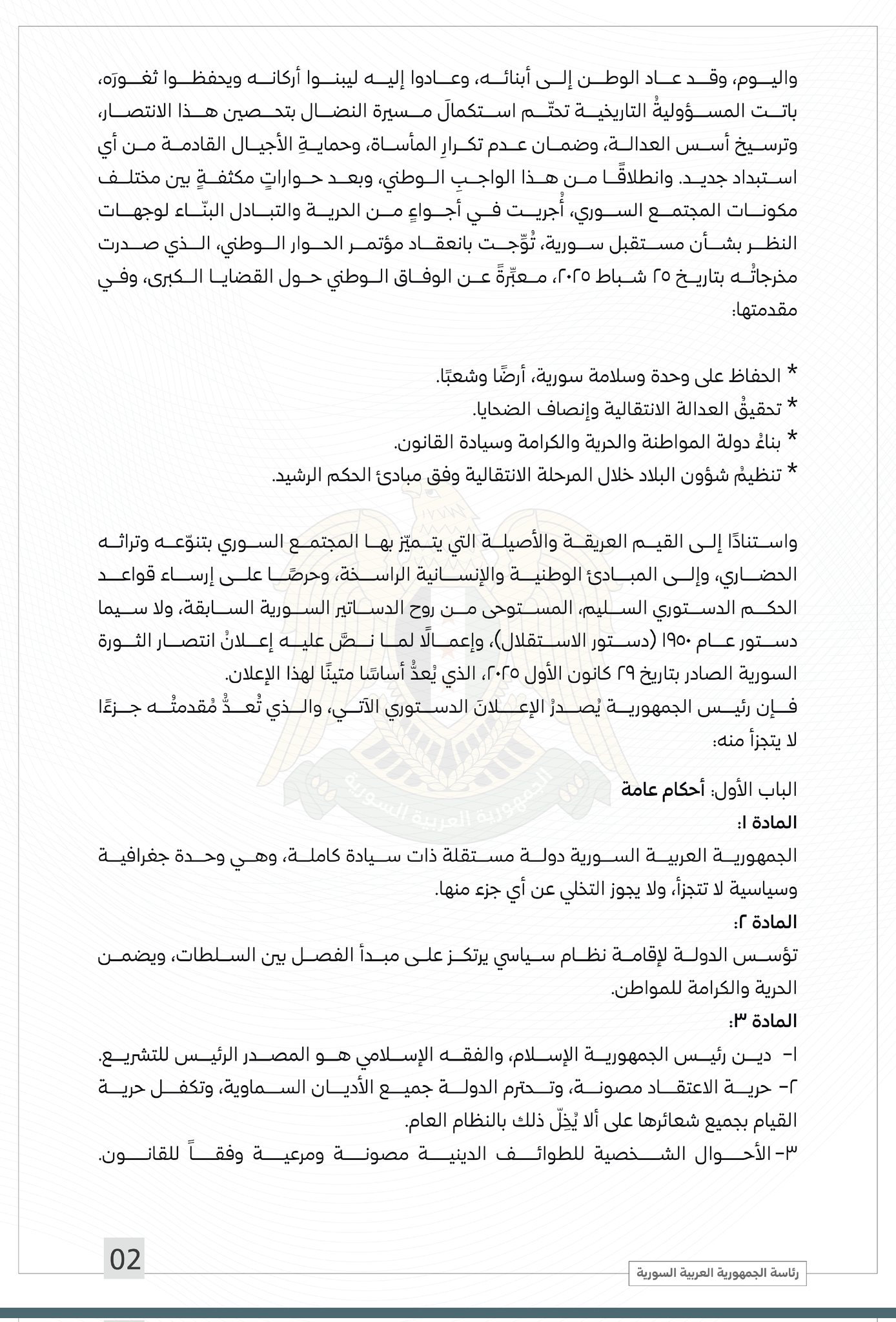 نشرت الرئاسة السورية، مساء اليوم الخميس 13 مارس 2025، النص الكامل للإعلان الدستوري الذي وقع عليه الرئيس أحمد الشرع.