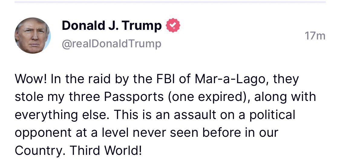 وكتب ترامب في منشور عبر حسابه على Truth Social: “في الغارة التي نفذها عناصر الـFBI على مار إيه لاغو، سرقوا جوازات سفري الثلاثة (واحد منهم منتهي الصلاحية)، بالإضافة إلى أشياء أخرى. هذا اعتداء على خصم سياسي على مستوى لم يحصل سابقا في بلدنا.. دولة عالم ثالث”.