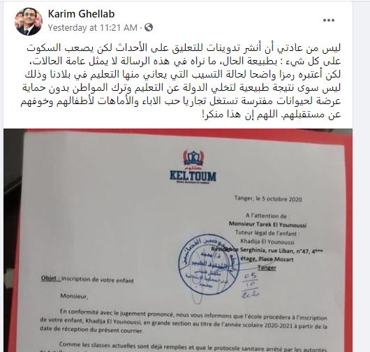 ونشر غلاب تدوينة غاضية يوم أمس الجمعة، على حسابه الرسمي على الفيسبوك، مرفقا ذلك بوثيقة صادرة عن المدرسة الخصوصية التي فجرت هذه الفضيحة الغير مسبوقة.