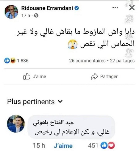 الرمضاني كتب “دبا واش المازوط ما بقاش غالي ولا غير الحماس اللي نقص“، فعلق عليه أحد المتابعين “غالي، ولكن الإعلام لي رخيص“.