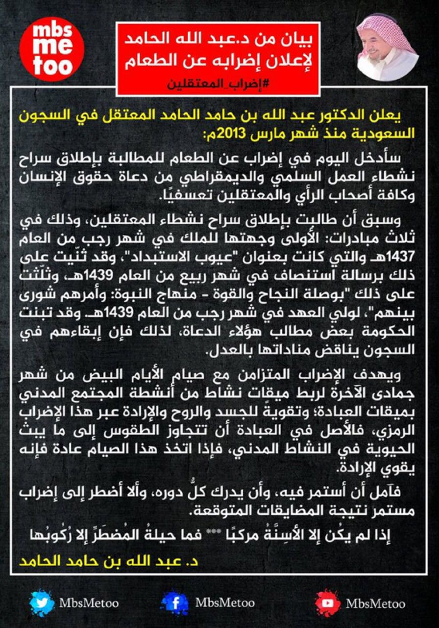 وورد في البيان: ” يعلن الدكتور عبد الله بن حامد الحامد المعتقل في السجون السعودية منذ شهر مارس 2013:” سأدخل اليوم في إضراب عن الطعام للمطالبة بإطلاق سراح نشطاء العمل السلمي والديمقراطي من دعاة حقوق الإنسان وكافة أصحاب الرأي والمعتقلين تعسفياً.