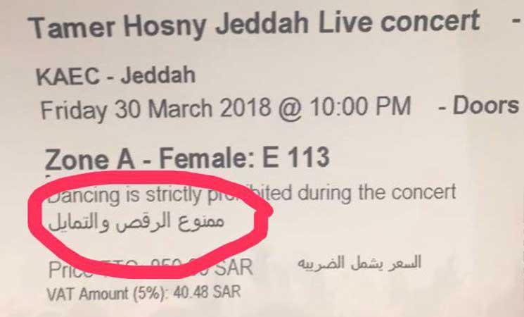 تداول ناشطون على مواقع التواصل الاجتماعي صورة لتذاكر حفلة المغني المصري “تامر حسني” التي ستقام في 30 الشهر الجاري في مدينة جدة بالسعودية مع وجود شرط “ممنوع الرقص والتمايل”.