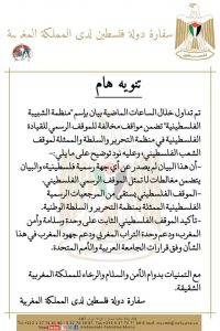 السفارة الفلسطينية لدى المملكة المغربية تتبرأ من بيان متحامل على قضية الصحراء المغربية (وثيقة)